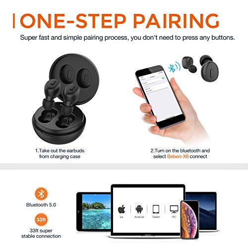 [BLUETOOTH 5.0 & One-Step Pairing] BEBEN-X8 equipped with advanced Bluetooth 5.0 technology, provides more stable and One-Step connection to you. Only need to take out two earbuds or any single earbud after you open Bluetooth function, they will open and connect automatically. BEBEN-X8 Supports A2DP, AVRCP, HFP, HSP, can connect with Laptop, iPad, iPhone, Android and talk to SIRI.